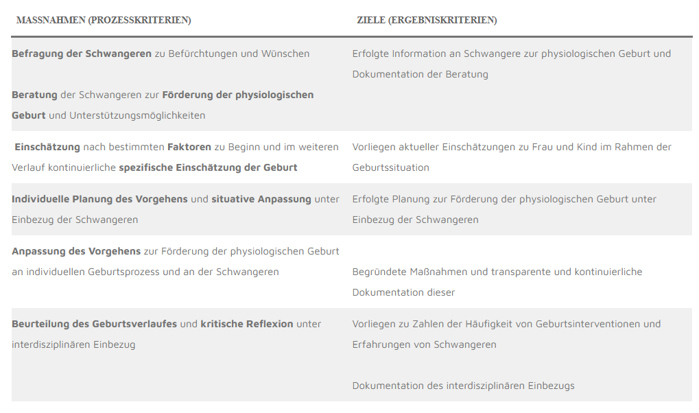 Tabelle 1 Prozess- und Ergebniskriterien zur Förderung der physiologischen Geburt