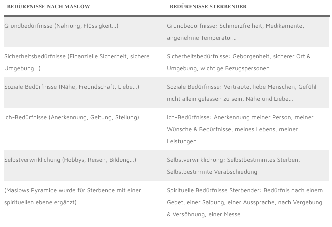 Die Bedürfnisebenen von Sterbenden können an die Bedürfnisse nach Maslow angelehnt werden. Eine Bedürfnisebene muss gestillt sein, damit die nächste erreicht wird. Kontext, individuelle Geschichte, kulturelle und soziale Prägung der Trauerenden und Sterbenden dürfen dabei nicht außer Acht gelassen werden.