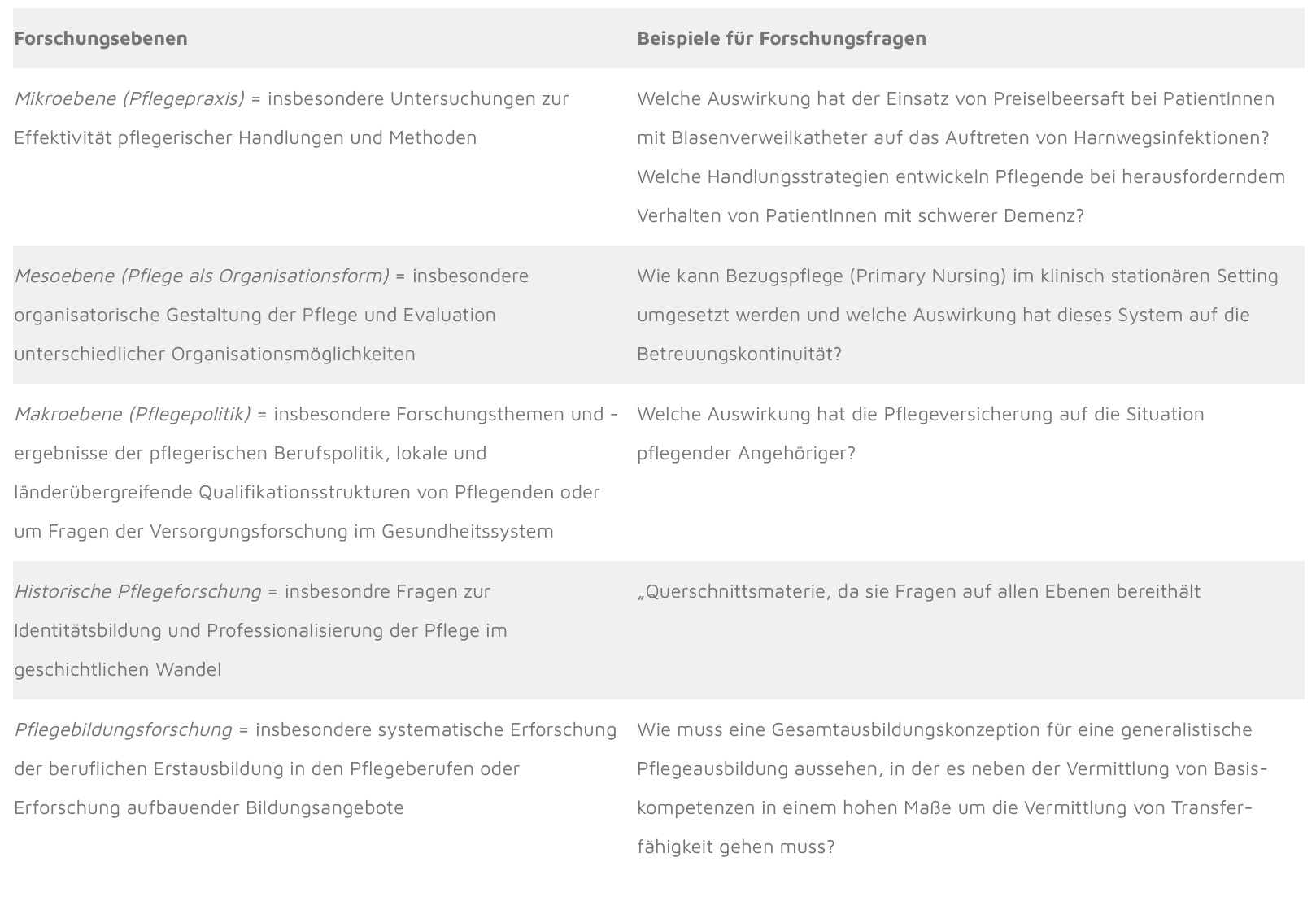 - Anpassung und Weiterentwicklung der Forschungsmethoden, speziell für pflegewissenschaftliche Fragestellungen